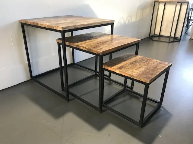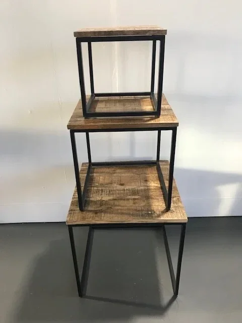 Een set van 3 mooie bijzettafels in mangohout. Je kan ze gebruiken als salontafels of om decoratie op te plaatsen. Ze geven een moderne, stoere uitstraling aan je interieur. Het zwart metalen onderstel zorgt voor stevigheid en stabiliteit. Het massief houten tafelblad is slijtvast en gemakkelijk te onderhouden. Er zijn verschillende bijpassende meubels in dezelfde stijl verkrijgbaar.