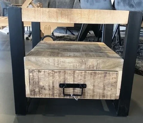 De combinatie van hout en metaal zorgt voor een gezellige en stoere look. Het heeft een strakke vormgeving en is gemaakt van mangohout. Daarnaast heeft het ook 1 schuif waarin je voorwerpen kan opbergen.